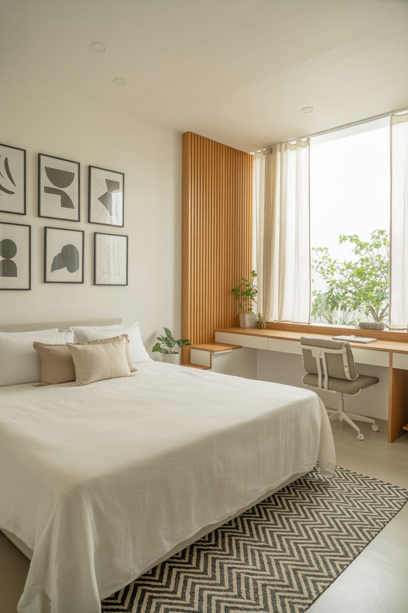 A világos színek (fehér, bézs, halványszürke), mennyezetig érő polcok, nagy tükör, áttetsző függöny, kevés dekoráció és letisztult anyaghasználat mind optikailag tágítják a szobádat.