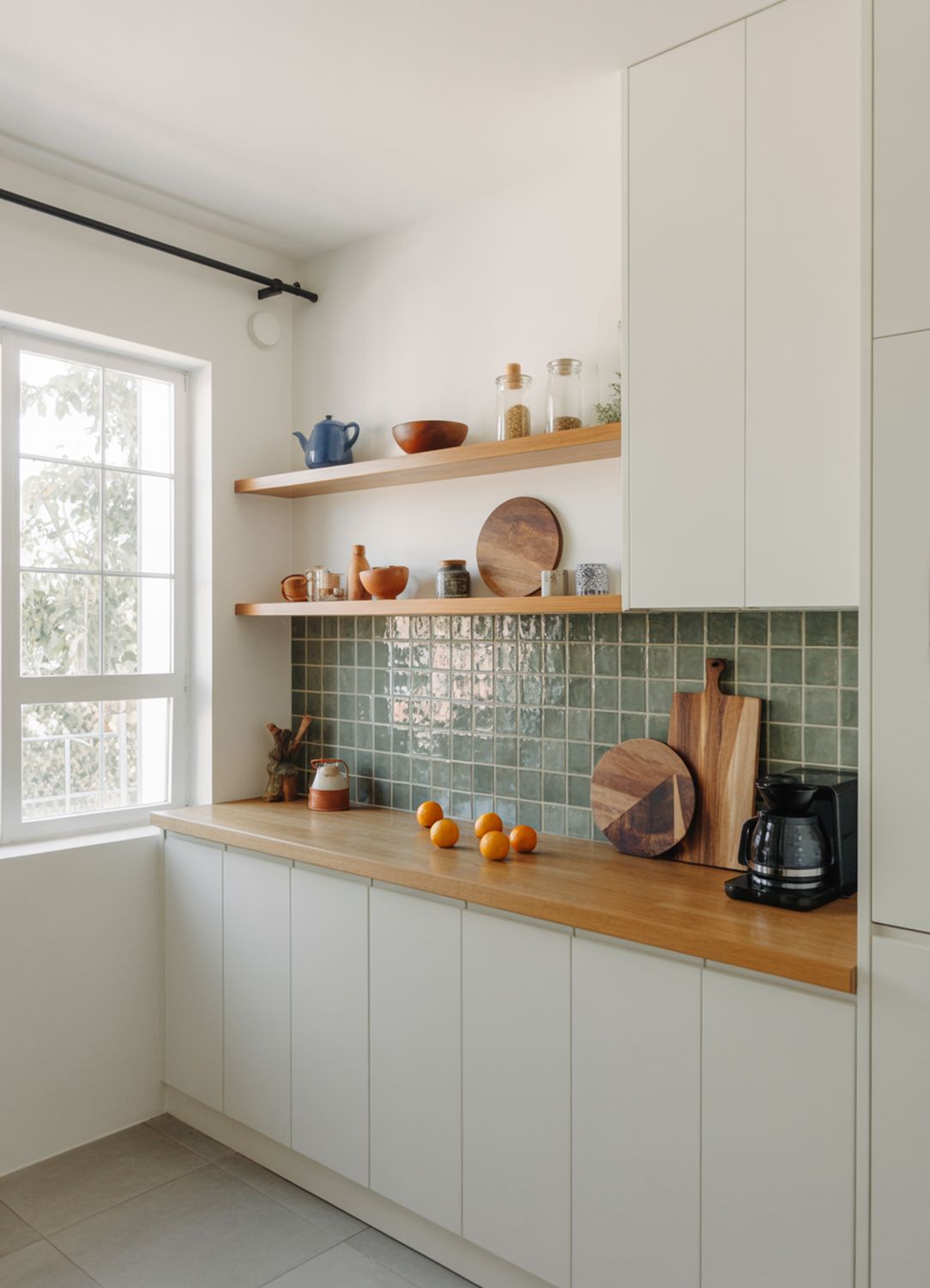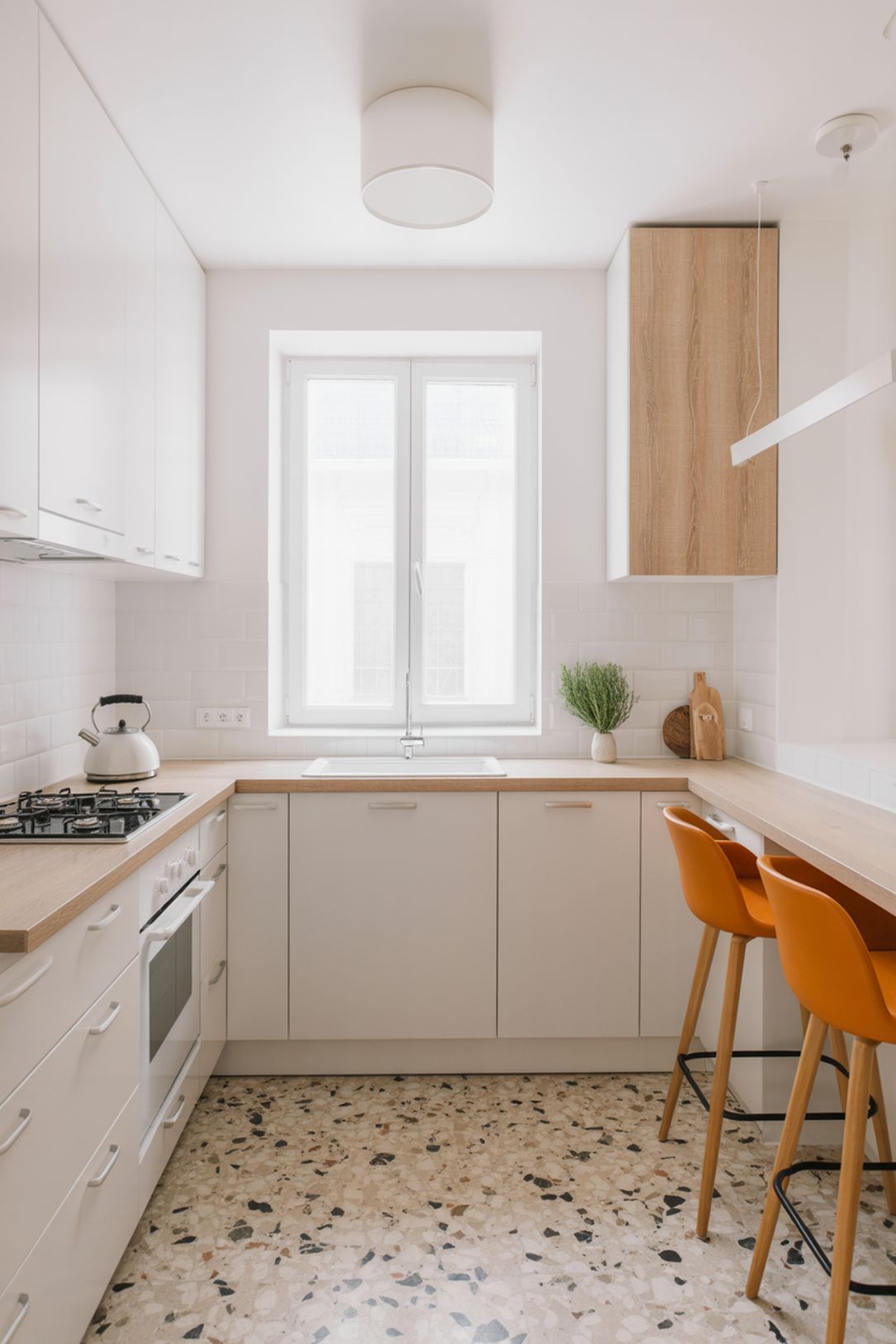 Világos, natúr színek (fehér, bézs, világosszürke, tölgyfa vagy kőhatás) optikailag növelik a teret. A magasfényű vagy matt frontok, strapabíró gránit- vagy kerámiapultok, letisztult csempe mind tartós megoldás.